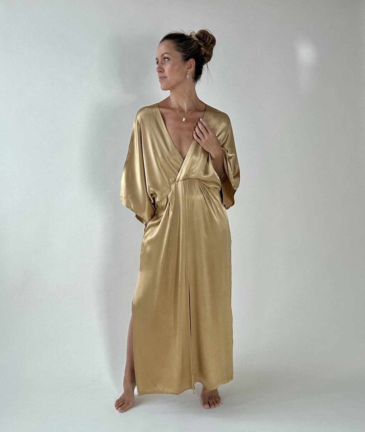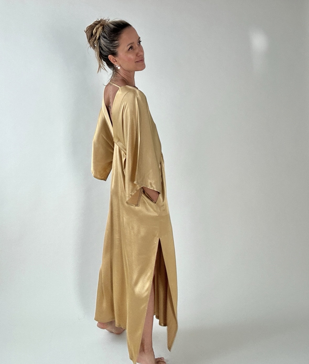 Bohemian-inspired satin dress with a flattering V-neck, open back, and relaxed silhouette for effortless style.